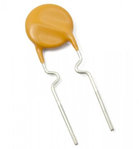 Radial through-hole PTC-fuse. The fuse is triggered when the current exceeds the trip current and is reset when the fuse has cooled down and the over current is removed. The holding current indicates maximum safe current that can pass through the fuse.