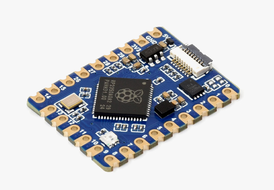 The board is equipped with castellated connections, allowing it to be soldered directly onto a custom PCB as an SMD module. Supplied with USB module connector and a 15 cm FPC cable. RP2350-Tiny is suitable for embedded systems, IoT nodes, and products where minimal size is required.