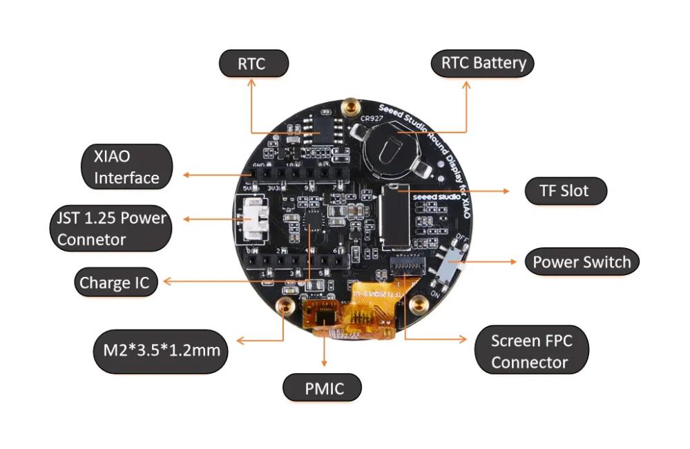 Round display for Seeed Studio XIAO development boards. Compact round touchscreen module for the Seeed Studio XIAO series. The module features a 1.28-inch round display with 240 x 240 pixel resolution and 65K colors, making it suitable for small HMI interfaces, smart home projects, and other compact builds.
