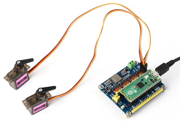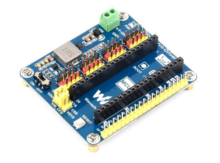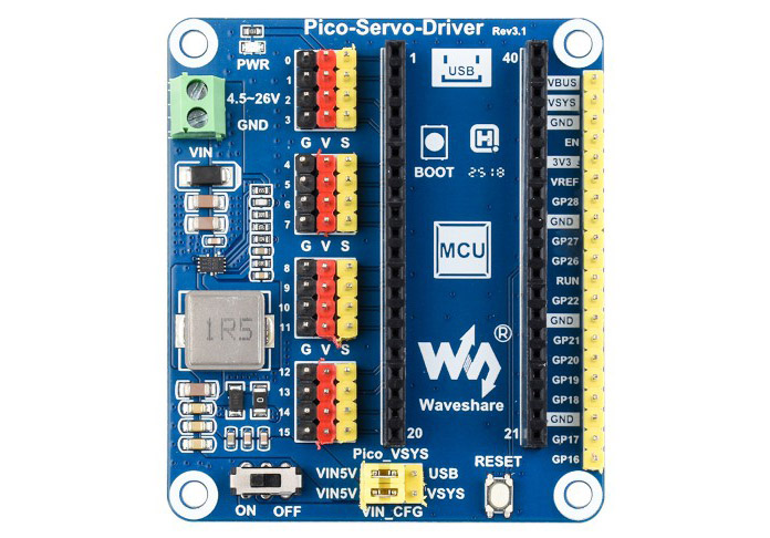 Servo driver for Raspberry Pi Pico with 16 channels and 16-bit resolution. Intended for servo and PWM control. Connects directly to the Pico board pin header. The board is suitable for servo systems such as robot arms or walking robots. Provides precise position control of multiple servos simultaneously. Unused GPIO pins from the Pico are accessible for easy expansion with additional sensors or modules. Development resources are available, including examples for both C/C++ and MicroPython. Servos, Raspberry Pi Pico, and external power supply are not included.