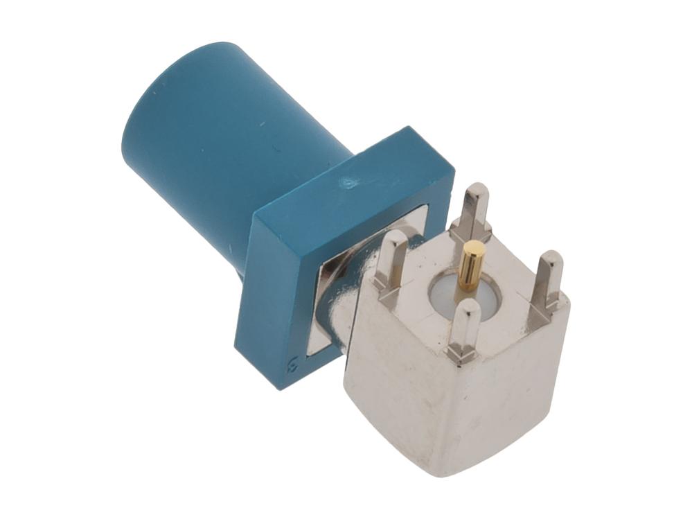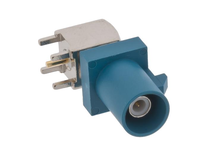 Kretskortsmonterad, vinklad FAKRA-kontakt. Används ofta för DAB, GPS, LTE och WIFI. Klarar frekvensområde 0 - 6GHz.