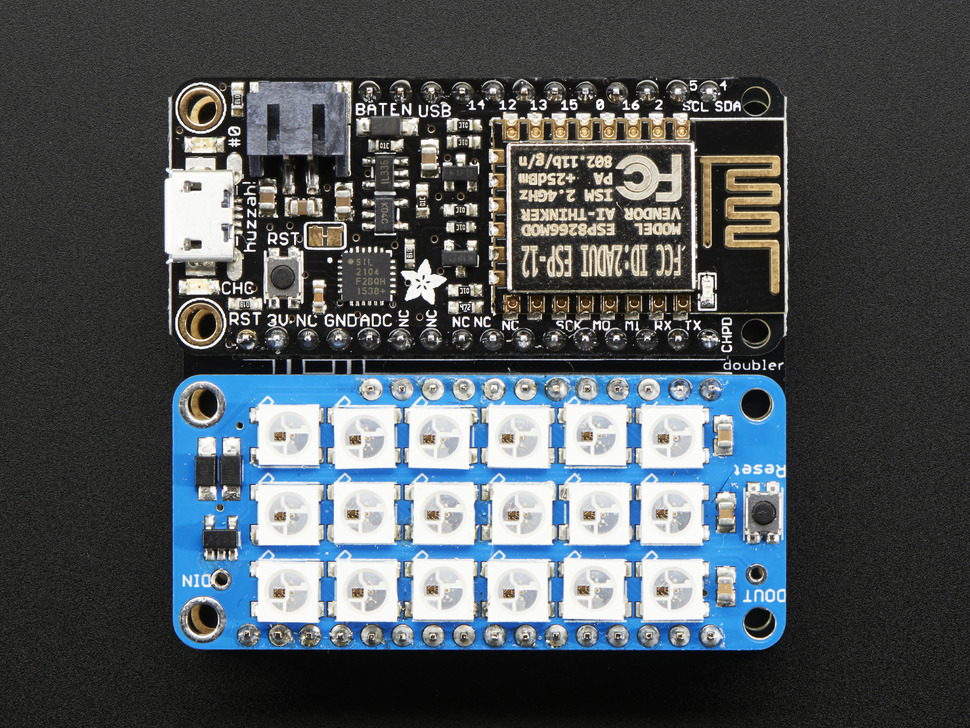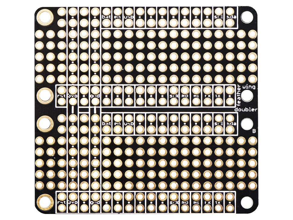 FeatherWing Doubler är ett dubbelt prototypkort för Adafruit Feather. Jord och spänning är anslutna, och det finns extra hål anslutna till hylslisternas ben. Eftersom dessa inte är anslutna till något kan man använda FeatherWing Doubler för att koppla om i de fall flera FeatherWings behöver tillgång till samma port, eller om man vill testa kommunikation mellan olika Feathers och FeatherWings.