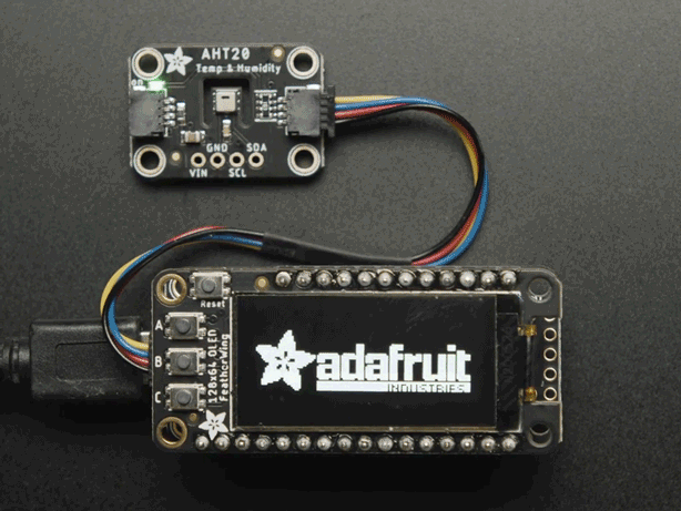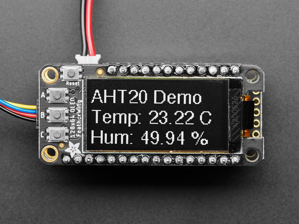 Displayen (SH1107) pratar I2C och givetvis finns det bibliotek för både Arduino och CircuitPython. Testad och kompatibel med alla Adafruit Feather-kort.