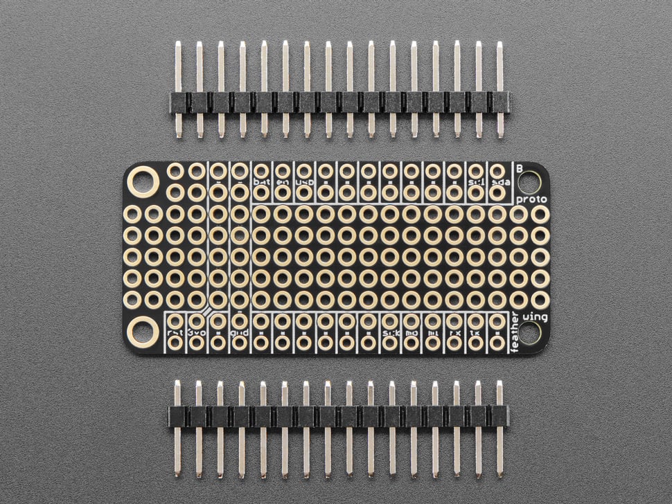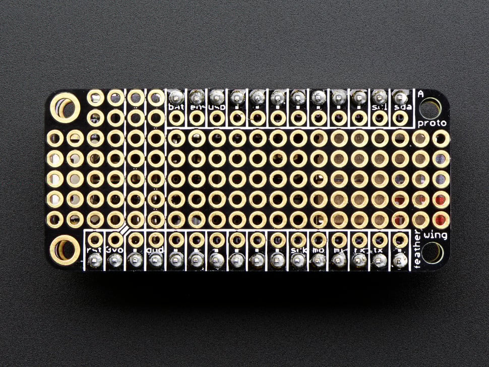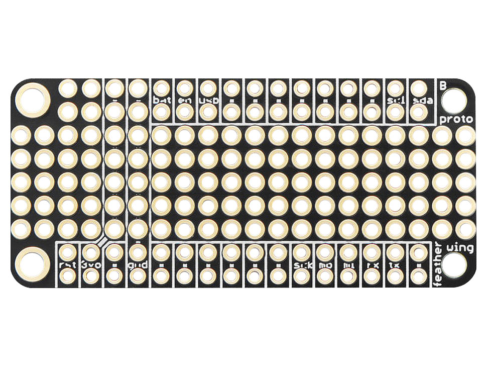 FeatherWing Proto är ett expansionskort för Adafruit Feather-kort för egna prototypuppkopplingar. Varje anslutning till featherkortet är duplicerat med ett motsvarande hål på prototypkortet samt två rader anslutna till 3.3V och GND.