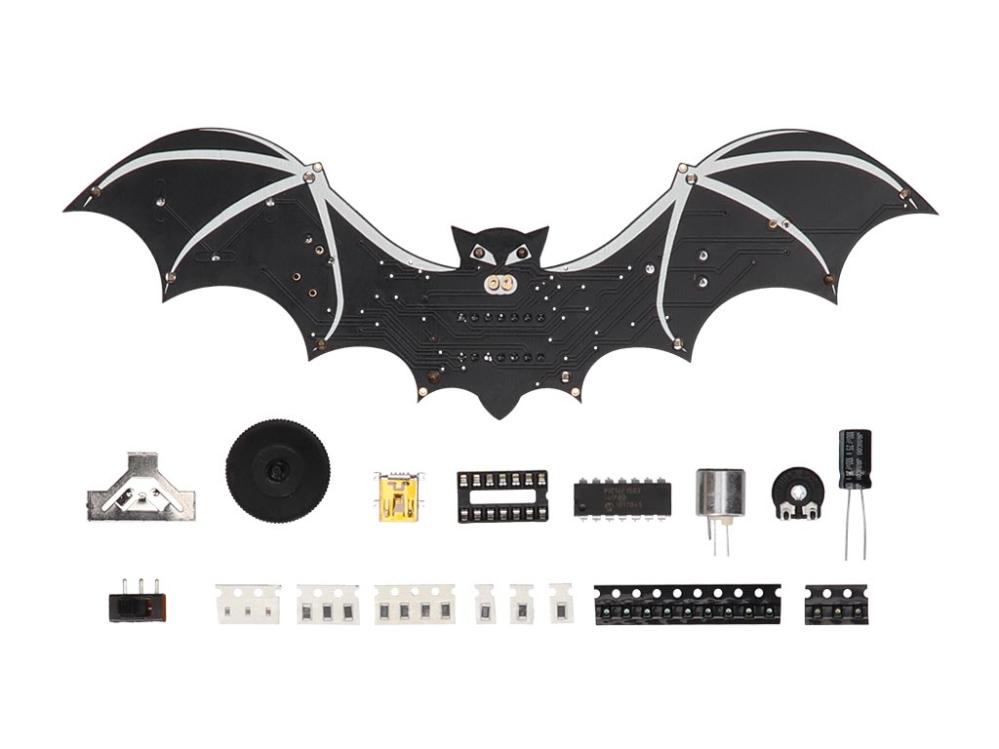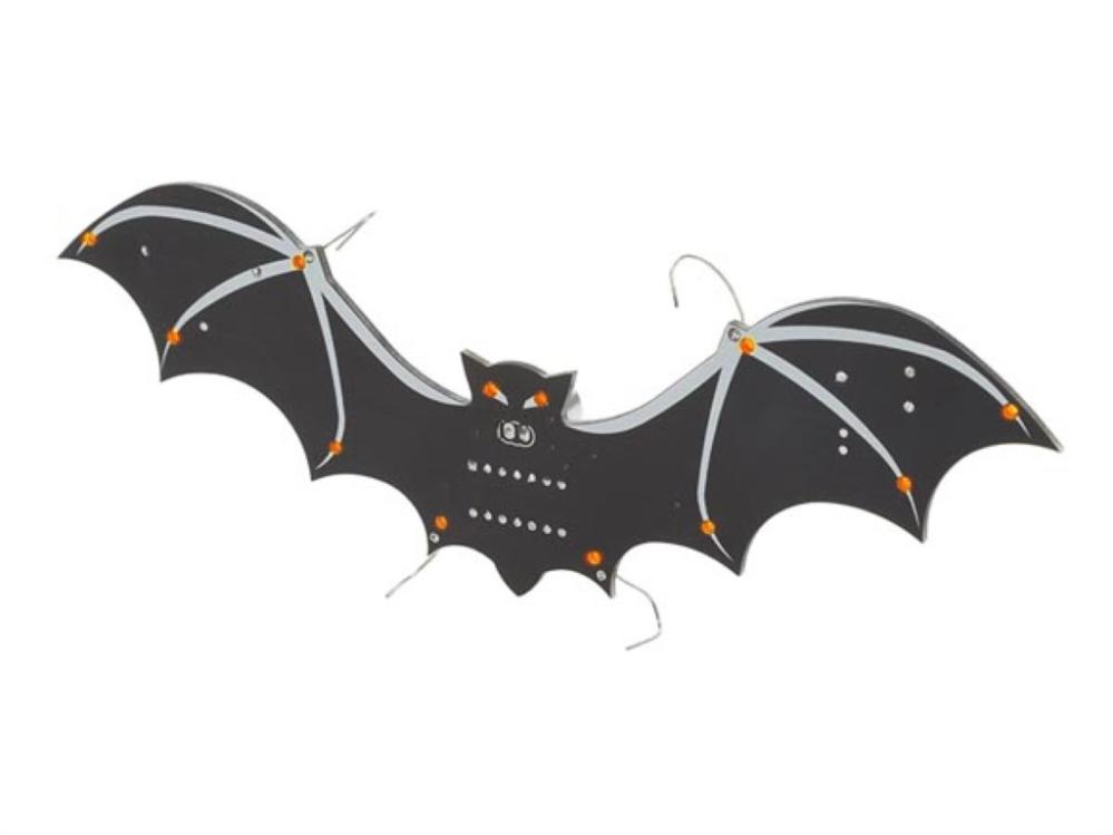 Fladdermus, SMD-byggsats i form av en fladdermus som kombinerar dekorativ belysning med ett praktiskt introduktionsprojekt i SMD-lödning. När den inbyggda mikrofonen registrerar ljud aktiveras de orange lysdioderna, vilket gör fladdermusen till effektfull dekoration. Byggsatsen innehåller en blandning av hålmonterade komponenter och SMD-komponenter, vilket ger en bra övergång för den som vill lära sig att löda små SMD-komponenter.