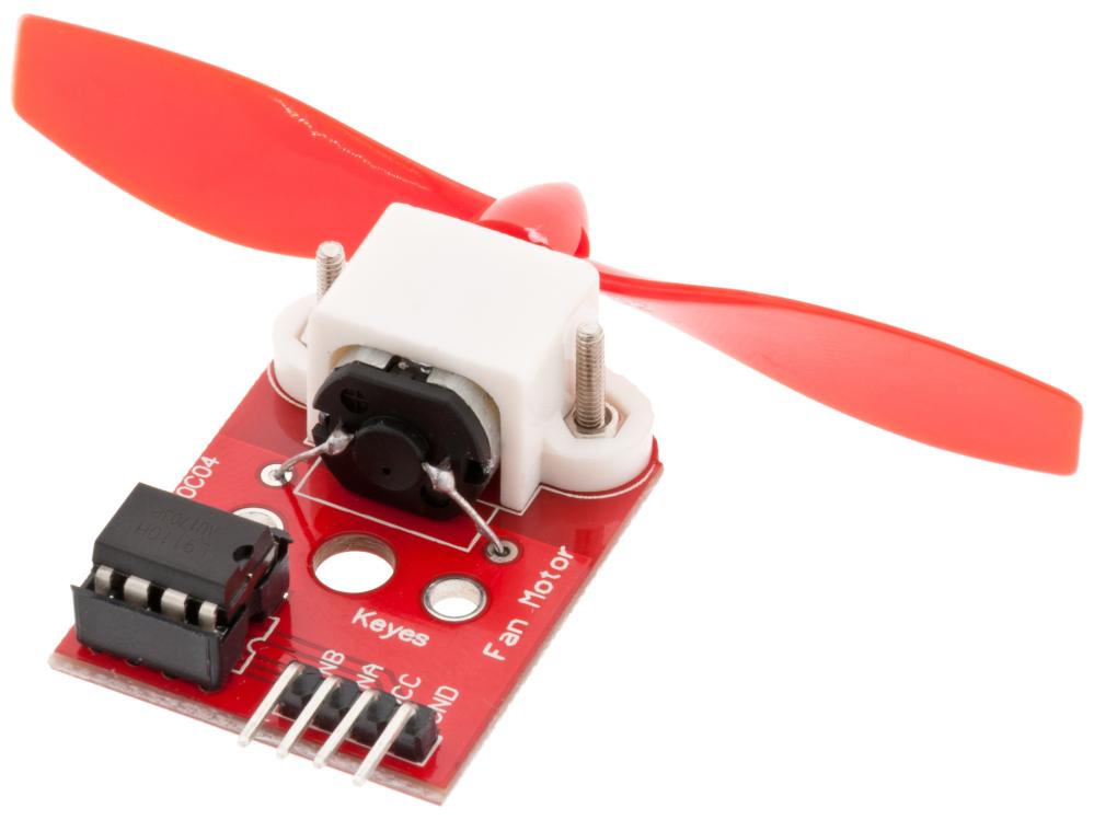 Modul med en H-brygga (L9110), DC-motor och fläktblad. H-bryggan kan driva motorn åt båda hållen genom att ställa ingångarna INA och INB höga eller låga. Hastigheten kan regleras med pulsbreddsmodulering (PWM). Anpassad för styrning av små DC-motorer med exempelvis Arduino, Raspberry Pi, ESP32 eller liknande.