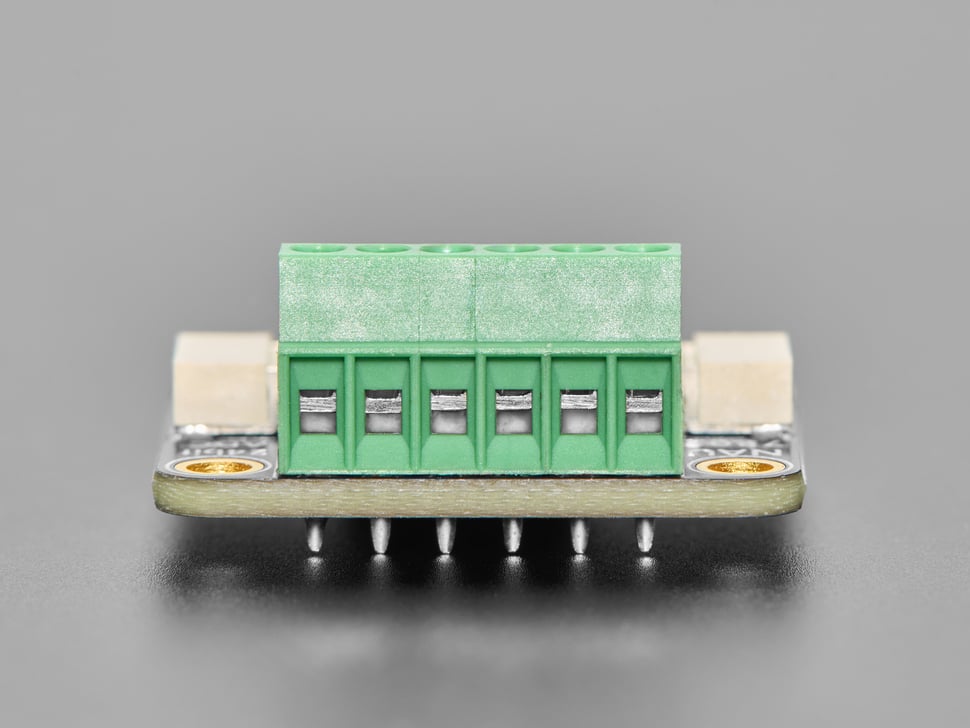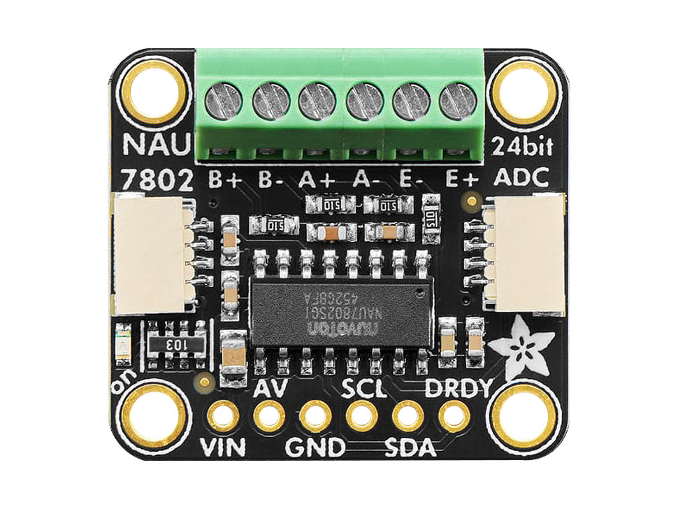 Modulen har skruvplint med för anslutning av fyrtrådiga sensorer. Anslutningarna är märkta E+ och E– för spänningsmatning (2.4–4.0 V konfigurerbart) samt A+ och A– för differenssignaler från sensorn. Kommunikationen sker via I²C-gränssnittet (Qwiic), och enheten är kompatibel med både Arduino och CircuitPython. Observera att NAU7802 har en fast I²C-adress; för att använda flera enheter på samma buss krävs en I²C-multiplexer (t.ex. 41020444 eller 41003469).
