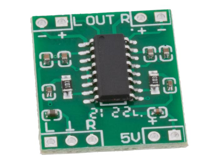Klass-D förstärkare med 3 + 3 W uteffekt (vid 5V / 4ohm). Modulen är uppbyggd kring förstärkaren PAM8403. Då förstärkaren är digital (klass-D) drar den extremt lite ström och är därför ett utmärkt val för batteridrivna projekt. Väldigt kompakt utförande, endast 2.8mm tjock.