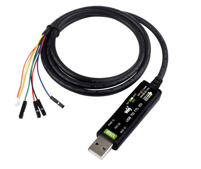 USB-till-UART TTL-seriekabel med FTDIs kontroller FT232RNL. Avsedd för seriell programmering och debugging. Omvandlar USB-gränssnittet hos en dator till UART med TTL-nivå på 3.3 eller 5 V (inställbart med switch). Försedd med 4 I/O-anslutningar (dupont hona) samt 3-polig (JST-SH) kontakt som passar UART-kontakten på Raspberry Pi.
