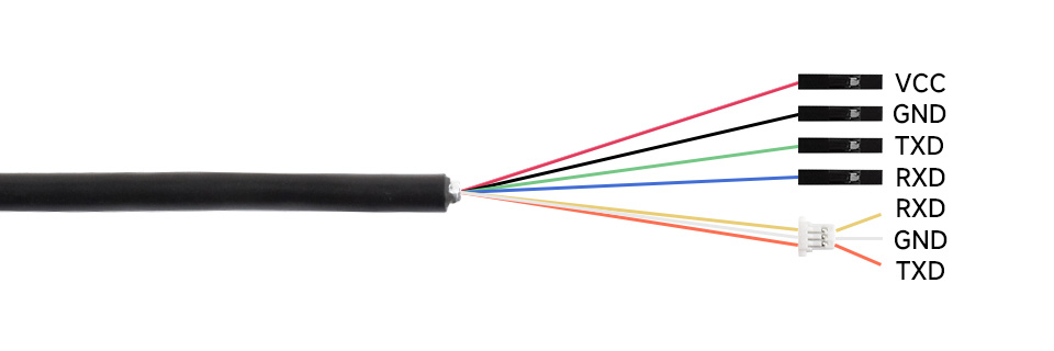 - Anslutningar: VCC (3.3 eller 5V), GND, TXD, RXD