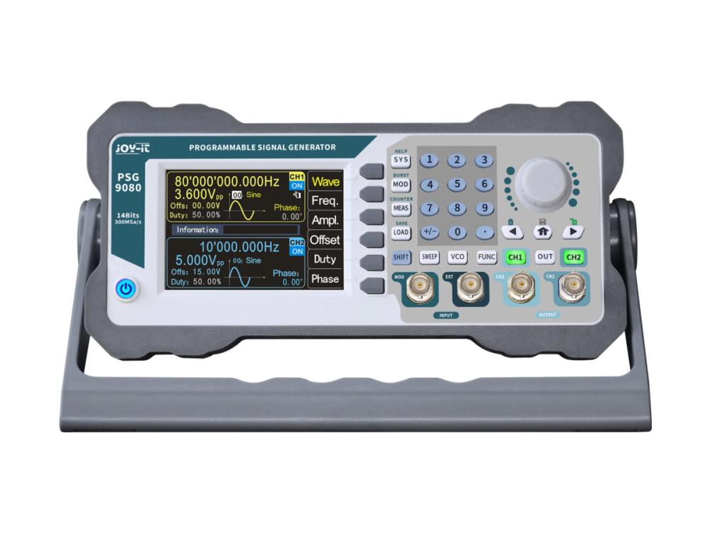 Klarar de vanliga vågformerna, brusgenerator, Lorentz-puls m.m. samt användarvågformer (AWG). Bland modulationstyperna listas AM, FM, PM, ASK, FSK, PSK, PWM, med antingen intern eller extern modulation. PSG9080 har såklart också burst och svep.