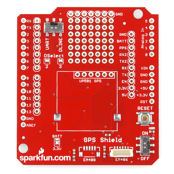 Arduinoshield för EM-406, EM-408, EB-85A och UP501 GPS-moduler. Alla anslutningarna från modulerna är utdragna på kortet. UART-anslutningen kan växlas mellan Arduinons UART eller valfria GPIOs. På shielden finns även plats för en batterihållare för 12mm knappcellsbatteri.