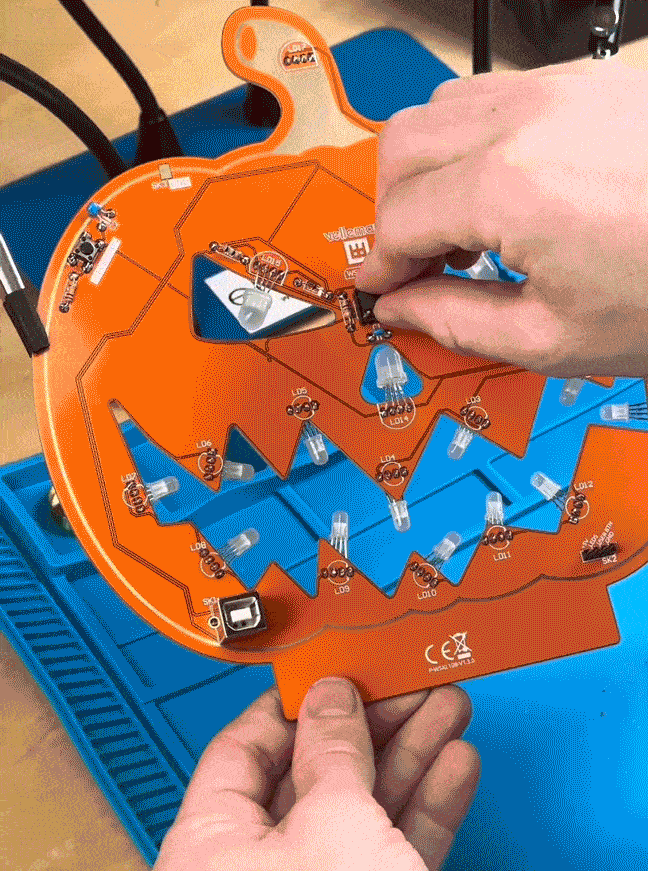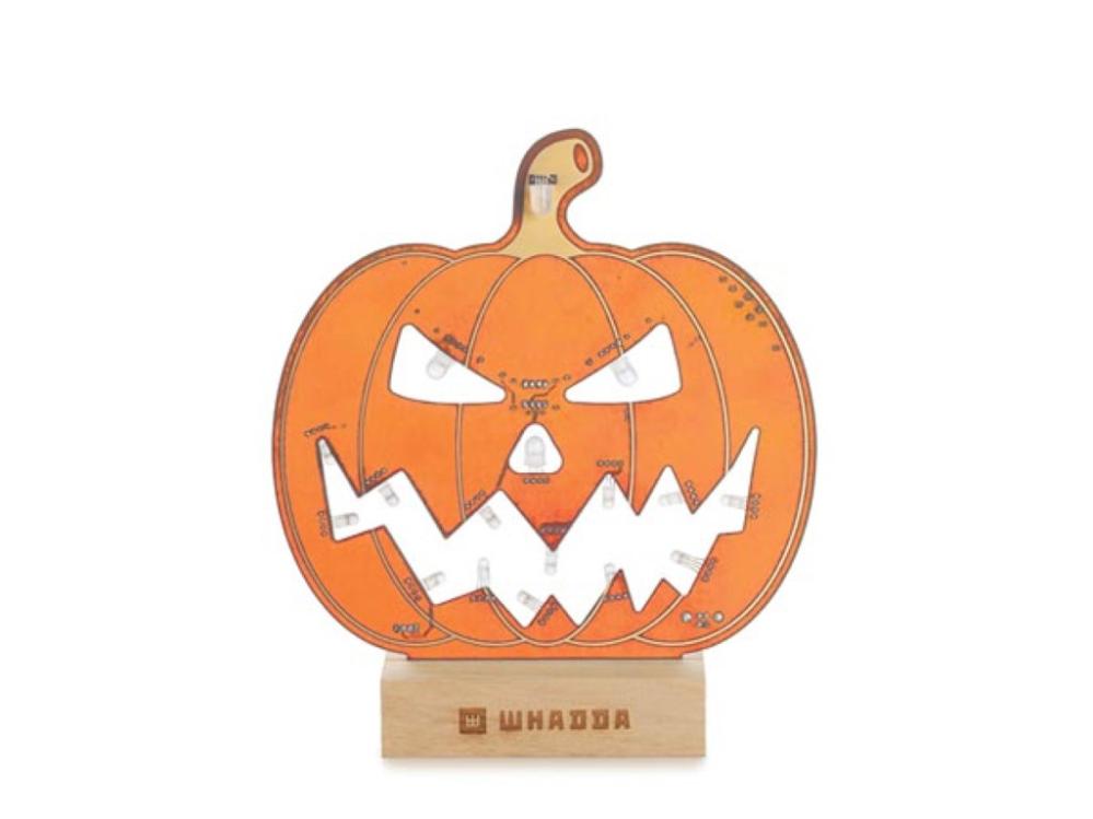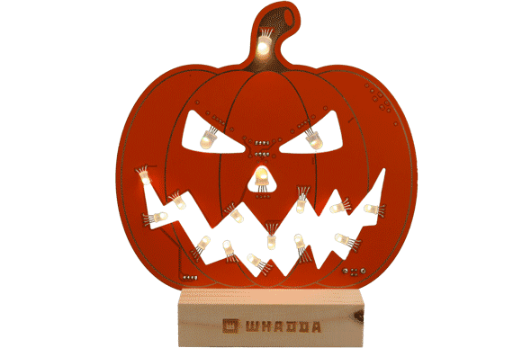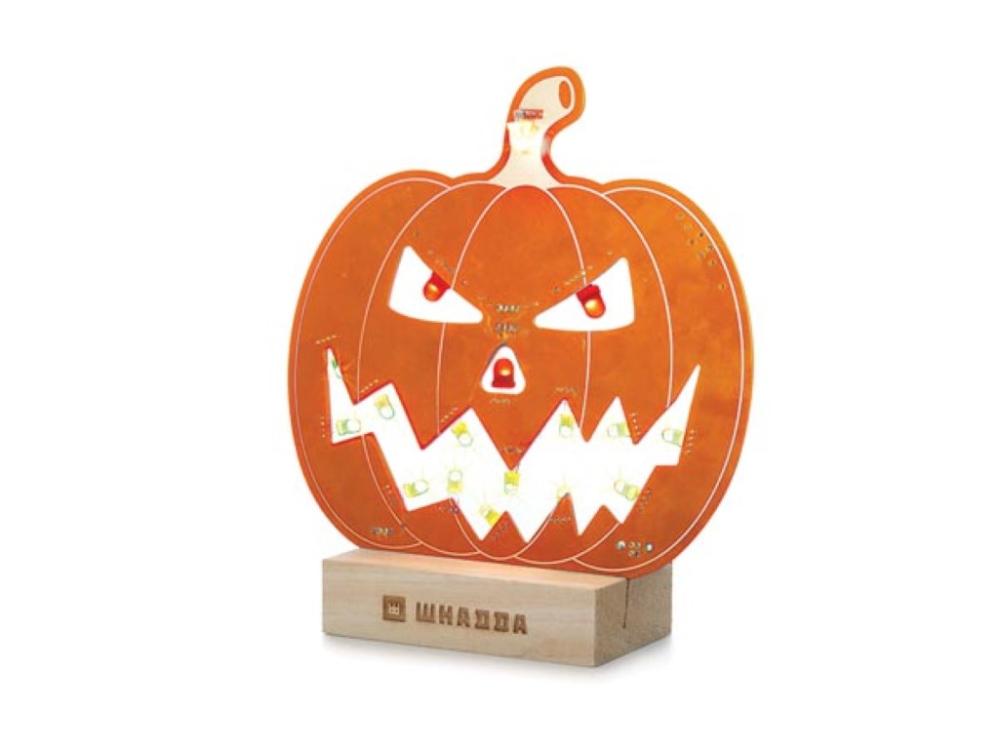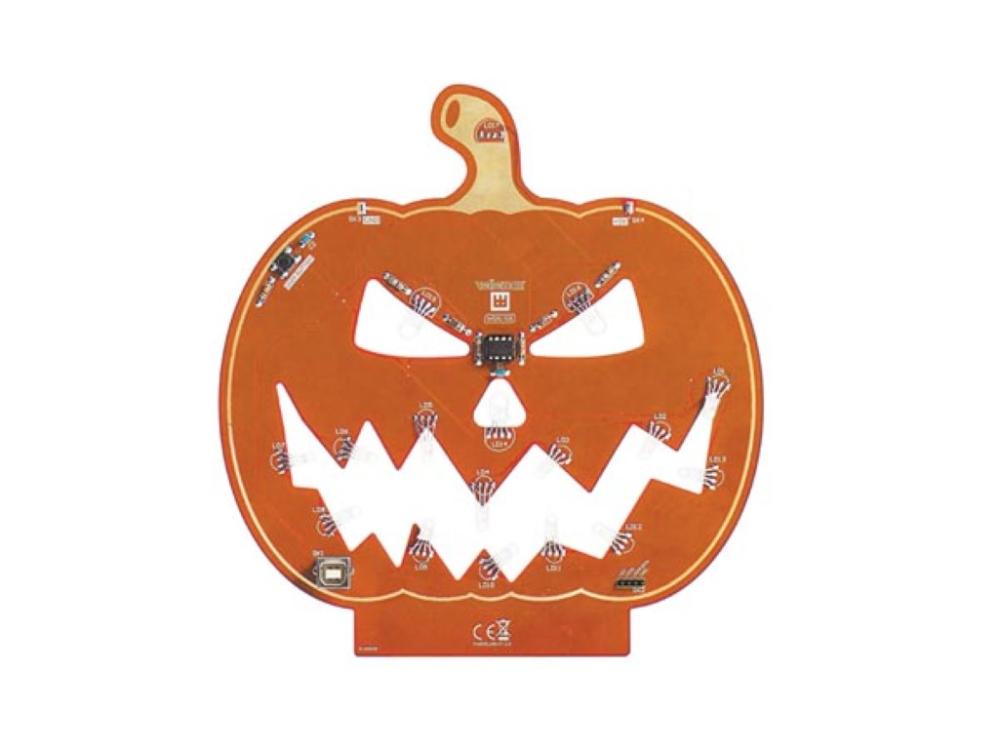 Stor halloween-pumpa (32 cm hög) med ljuseffekter, byggsats. Letar du efter ett roligt DIY-projekt inför Halloween? Bygg en mikrokontroller-styrd Halloween-pumpa med lysdioder i glada färgskiftningar! Detta pedagogiska och kreativa kit består av ett stort kretskort i form av en pumpa. Byggsatsen levereras med alla nödvändiga komponenter inklusive en förprogrammerad mikrokontroller och 16 st adresserbara RGB-lysdioder (neopixel-typ). Varje RGB-lysdiod är utrustad med den välkända styrkretsen WS2812 som styrs helt digitalt från mikrokontrollern. Mikrokontrollern, ATtiny 85 är förprogrammerad med 5 olika ljuseffekter. Byggsatsen levereras med ett praktiskt ställ i trä. Svårighetsgrad lödning/montering: lätt till medel. Drivs från 5 VDC / 2.1A. Levereras med 1 meter USB-kabel vilket gör att pumpan kan drivas från standard USB-laddare som levererar 10W (2.1A) eller mer, t.ex. 41031256 eller 41021803.