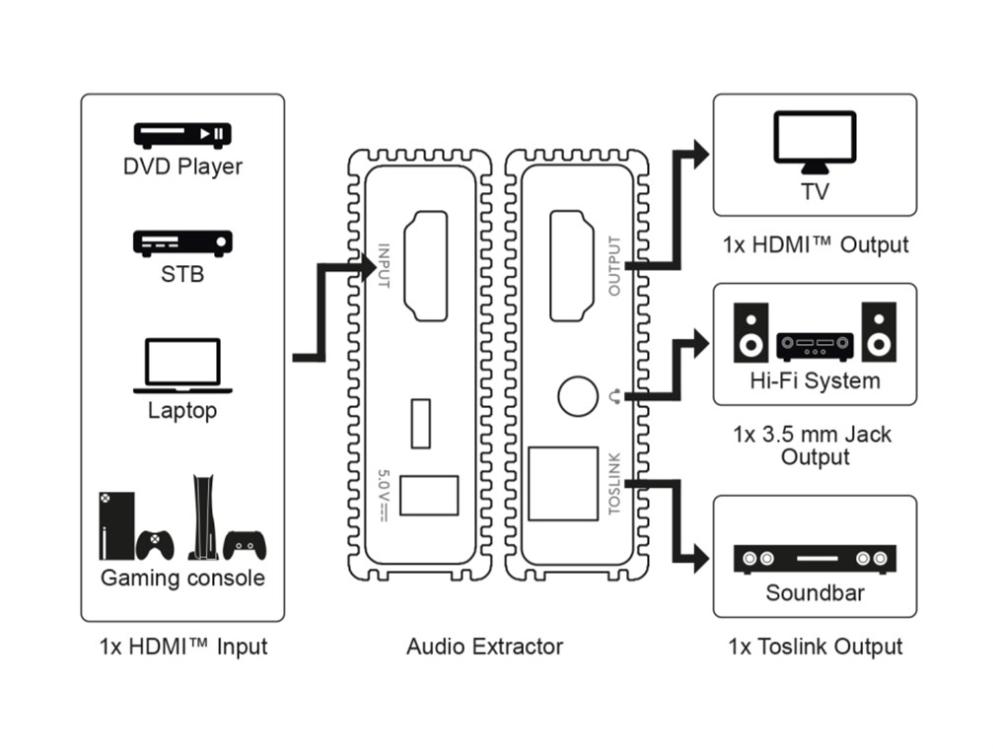 HDMI audioextraktor som separerar ljudsignalen från HDMI och gör det möjligt att ansluta externa ljudenheter samtidigt som videosignalen skickas vidare till TV eller bildskärm. En praktisk lösning för anslutning av hörlurar, förstärkare, soundbar eller högtalare till enheter som spelkonsol, mediaspelare eller dator. Stöd för både analog 3.5 mm stereo och digital Toslink. Klarar upplösning upp till 4K vid 30 Hz samt stöd för 3D-video. Robust konstruktion med aluminiumhölje. USB-strömförsörjning medföljer.