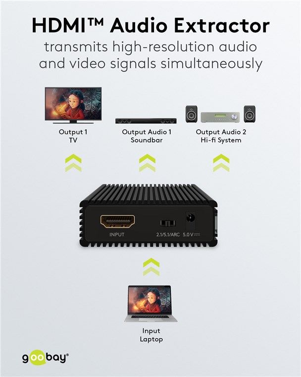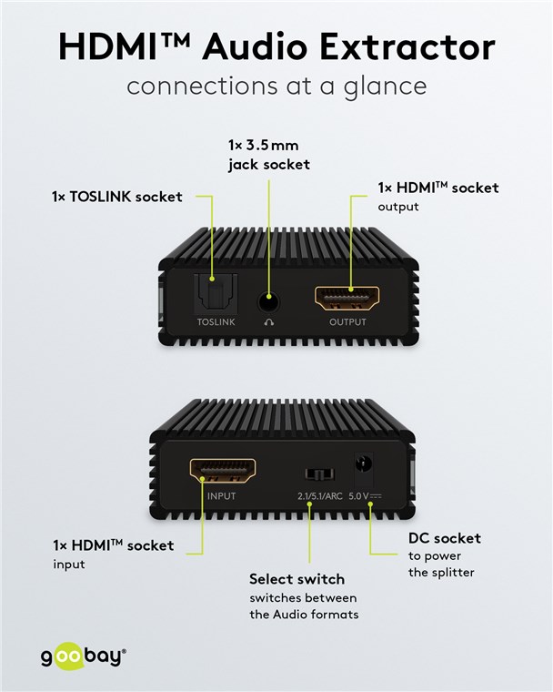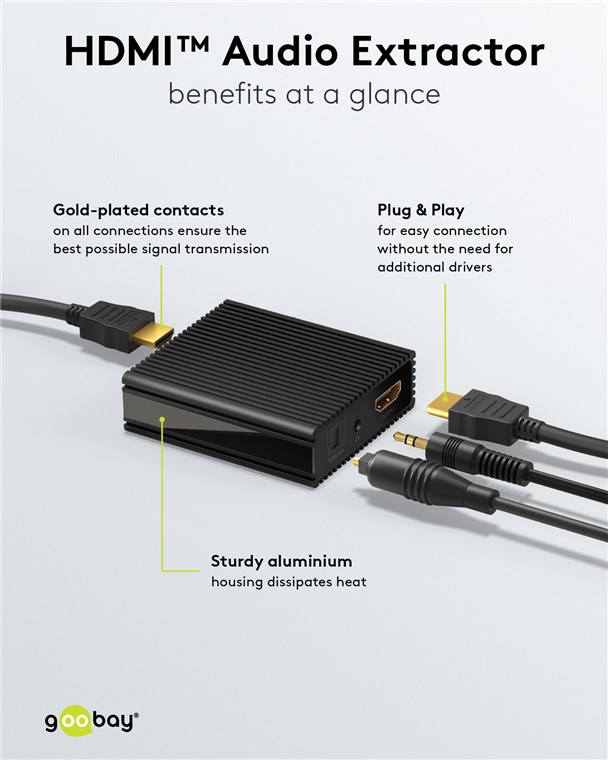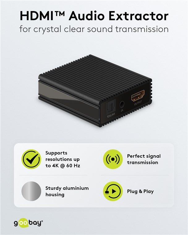 HDMI Audio Extractor bryter ut audiokomponenten från en HDMI-anslutning. Gör det möjligt att extrahera analog audio (3,5 mm) och/eller digital audio (Toslink) för anslutning till ett separat ljudsystem. Avsedd för installation i hemmabio- och multimediasystem där separata ljudutgångar saknas. Släpper även igenom audiosignalen opåverkad via HDMI-förbindelsen. Plug-and-play-funktionalitet, kräver ingen programvara. Levereras med nätadapter och manual.