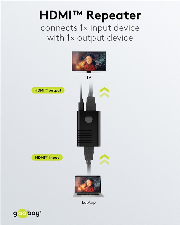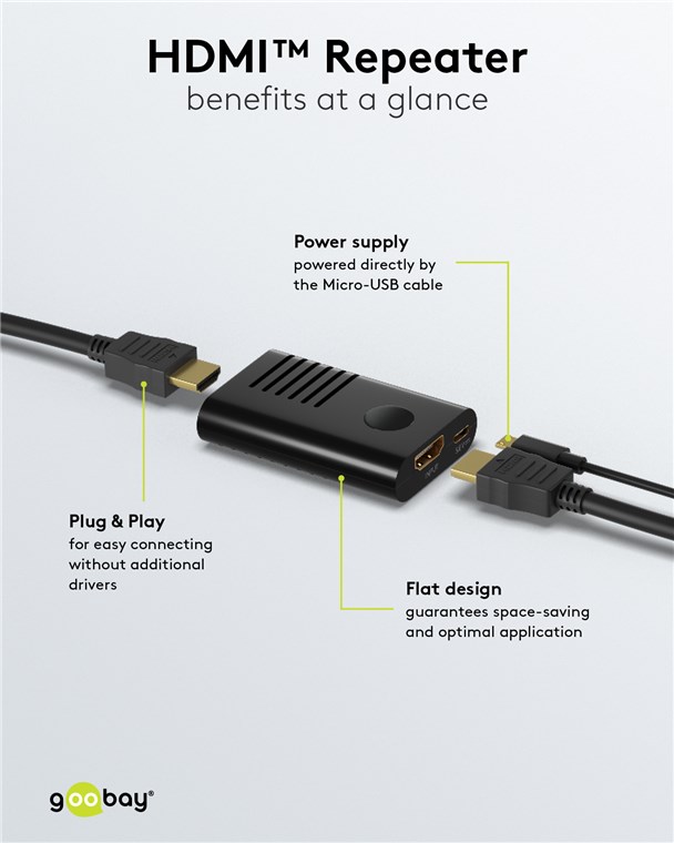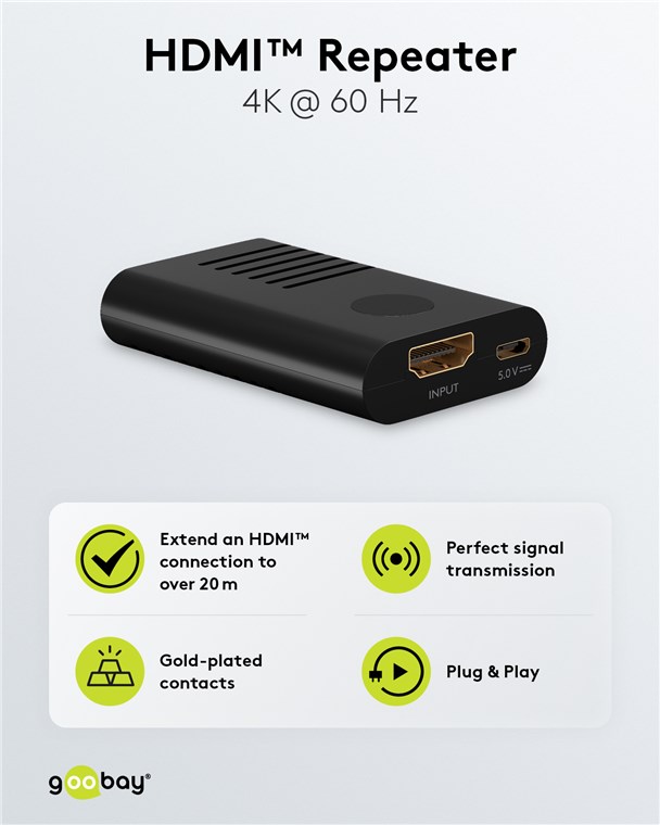 HDMI-Repeater är en aktiv HDMI-förstärkare avsedd att förlänga HDMI-signaler vid längre kabeldragningar. Den förstärker HDMI-signaler och möjliggör en bibehållen bild- och ljudkvalitet upp till cirka 20 meter vid 4K @ 60 Hz samt längre avstånd vid lägre upplösningar. Enheten drivs med 5 VDC via Micro-USB-strömförsörjning (USB-laddare/nätadapter medföljer ej) inte). Lämplig för anslutning av källor som datorer, spelkonsoler eller Blu-ray-spelare till TV, monitor eller projektor.