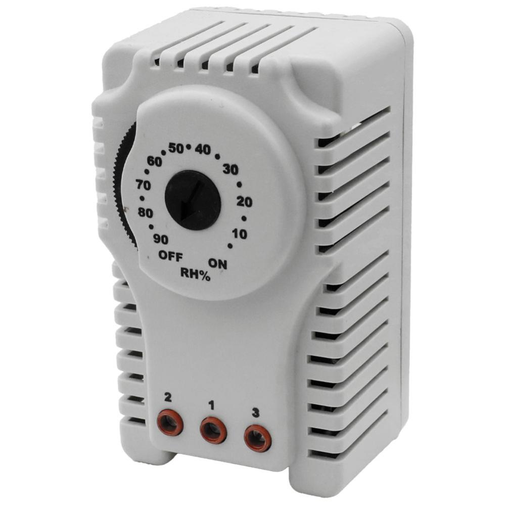 DIN-monterad Hygrostat. Monteras på DIN-skena för övervakning och reglering av relativ luftfuktighet. Lämplig för t.ex kapslingar, el-skåp eller andra volymer där det behövs en automatisk kontroll för att undvika kondensproblem. Med NC/NO-kontakt för anslutning av värmeelement, fläkt, avfuktare, etc. Hygrostaten är mekanisk, fungerar fär med utan egen drivspänning.