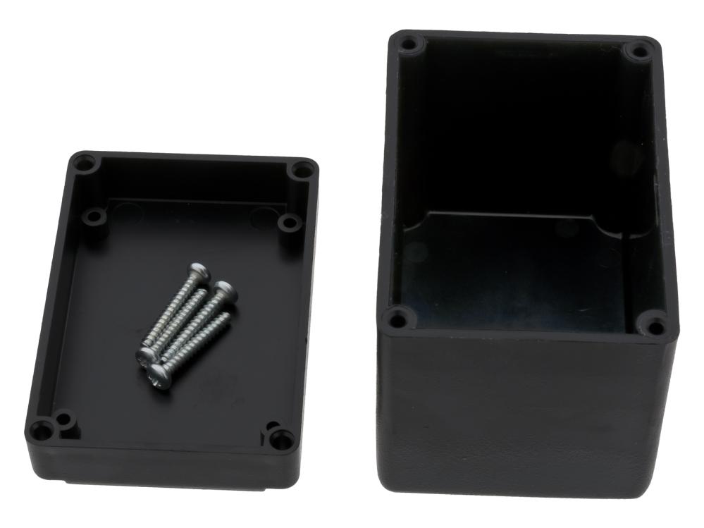 Inbyggnadslådan är lämplig för prototyputveckling, industriella tillämpningar samt serietillverkning. Den levereras med skruvar till locket. I lådan finns fyra skruvfästen för eventuell montering av kretskort.