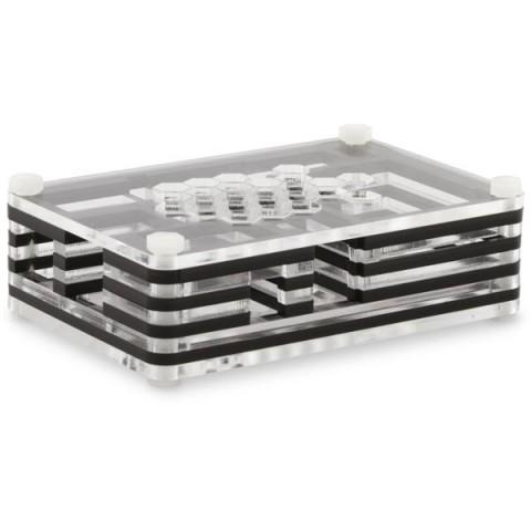Snygg låda för Raspberry Pi. Består av nio lager svart och transparent akrylplast. Lådan har ventilationshål på ovan- och undersida. Alla monteringsdetaljer medföljer.