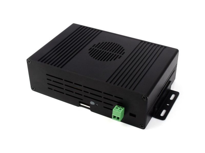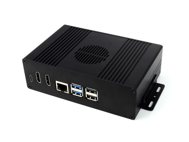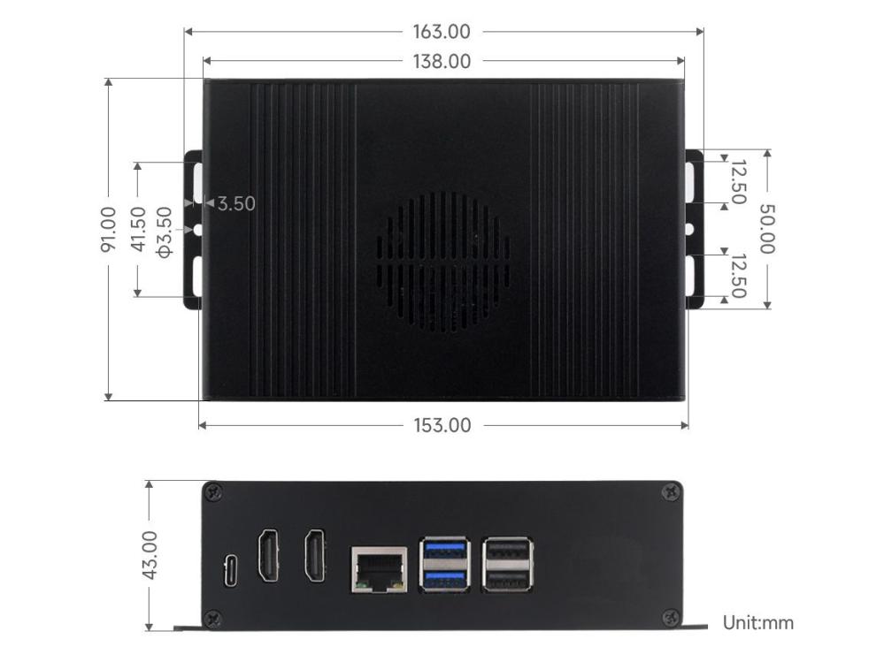 Lådan har flera smarta funktioner, bland annat ventilationshål, plats för montering av fläkt (ingår ej), vinklar för fastskruvning i t.ex. vägg, skrivbord eller andra möbler, två fullstora HDMI-utgångar, en USB-C-kontakt, ingång för matningsspänning, och en UART debugg-port som är nåbar utifrån. En pluggbar skruvplint för spänningsmatning ingår.