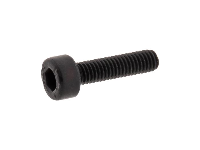 Svart maskinskruv (bult) i stål med cylindrisk skalle och insexgrepp. Svart finish. Gängad längs med hela skruven.