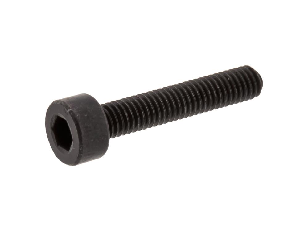 Svart maskinskruv (bult) i stål med cylindrisk skalle och insexgrepp. Svart finish. Gängad längs med hela skruven.