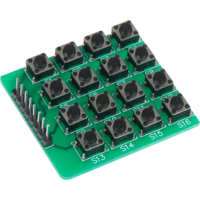 Knappsats med 16 knappar i en 4x4-matris. Matrisen gör att bara 8 I/O-linor behövs. Lämplig för prototyper, undervisning i programmering m.m.