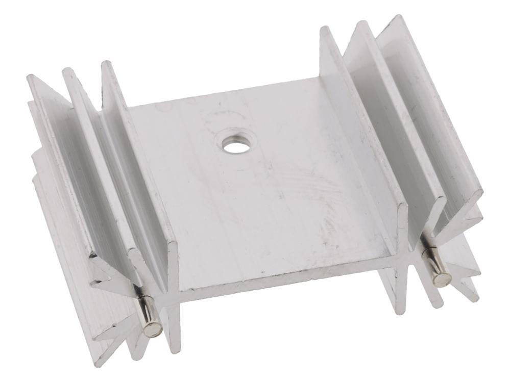 Kylfläns i naturfärgad aluminium. Passar till transistorer och spänningsregulatorer i TO-220 kapsel. Har pinnar för fastlödning i kretskort.