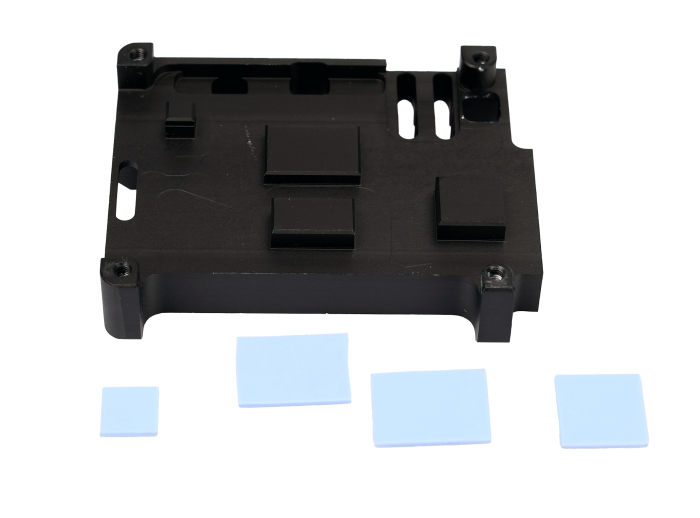 Kylfläns-låda av svarteloxerad aluminium för Raspberry Pi 5. Ger effektiv passiv kylning. Undersidan av kylflänsen är perfekt anpassad efter höjden på processor, minne, RP1-kontrollern och USB-kontrollern. Detta för att ge effektiv värmeavledning till hela kylflänsen. Självhäftande värmefolie-pads monteras mellan kretsar och kylfläns (medföljer). Lådan har öppningar för alla anslutningar, inkl. MicroSD, GIPO-headern, 2 st MIPI-anslutningar, PCI-Express-anslutning, RTC-batteri-anslutning, fläktanslutning samt UART-anslutning.