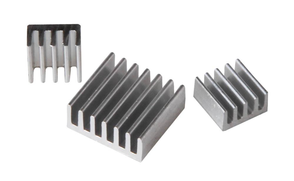 BGA kylfläns-set med en stor och två mindre kylflänsar. Setet är universellt användbart men passar bland annat till Raspberry Pi A, B, B+, Model 2 och Model 3.