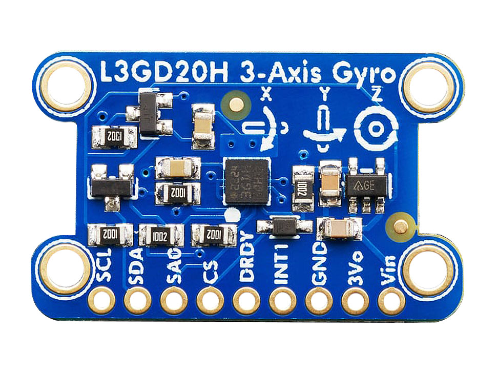 Adapterkort med ett L3GD20H 3-axels gyroskop. Gyroskop används för att mäta roterande rörelser och kombineras ofta med en accelerometer för att mäta rörelse och position. Gyroskopet kommunicerar via I2C och har en ställbar känslighet.