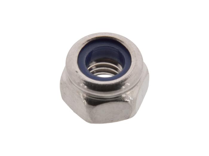 Låsmutter i rostfritt stål. En ring av polyamid låser fast muttern utan att en låsbricka behövs.