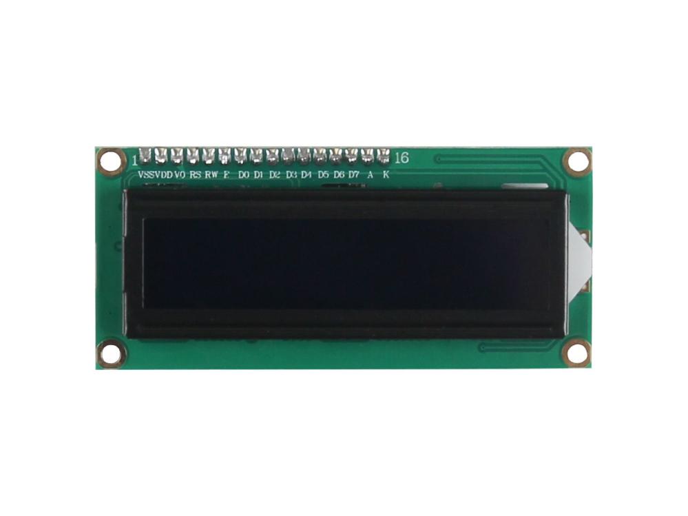 LCD-modul med 2 rader med 16 tecken. Lämplig för styrsystem, prototyper, utbildning och andra elektronikprojekt. Inbyggd blå bakgrundsbelysning.