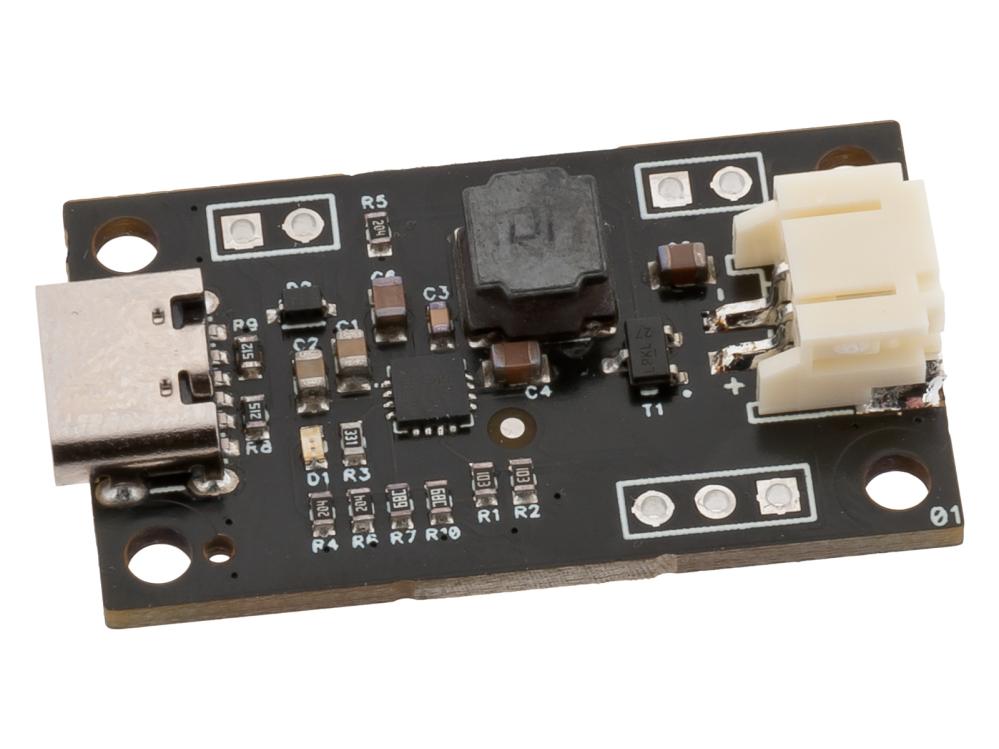Batteriladdarmodul för en Li-Ion- eller LiPo-cell. Laddaren har integrerad skyddsfunktion och justerbar laddström. Kortet är avsett för laddning av 3.6-3.7 V celler och erbjuder en flexibel konfiguration, via lödbryggor kan laddströmmen justeras mellan 0.2 A och 2 A. Modulen använder en högeffektiv switchande krets, BQ25302 från Tesas Instruments. Laddaren har power-path-funktion som möjliggör samtidig drift av ansluten last medan batteriet laddas.