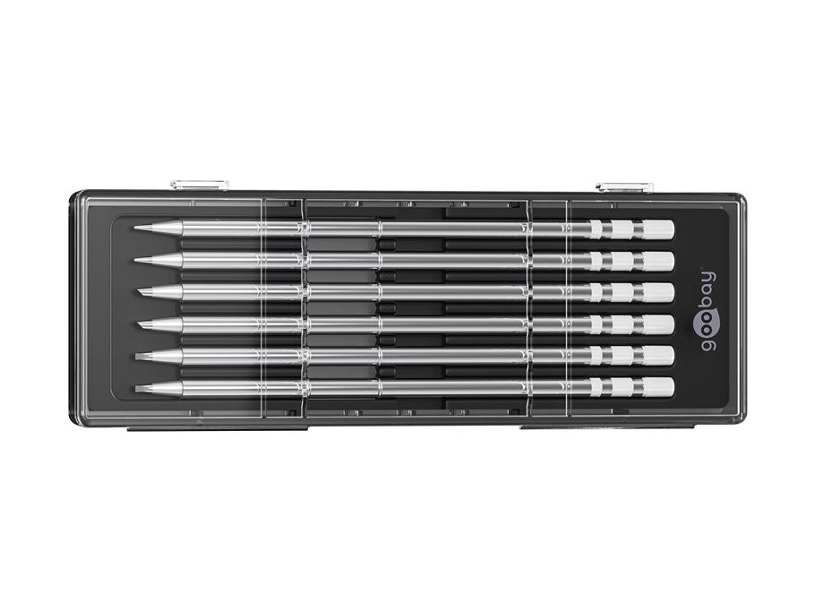 Sex utbytesspetsar till lödstationen 41036570. Tre olika spetstyper ingår, med en bra uppsättning storlekar för både små ytmonterade lödningar och lödning av större jordplan, direkt till chassi m.m. Levereras i en förvaringsask.