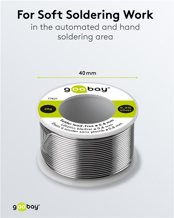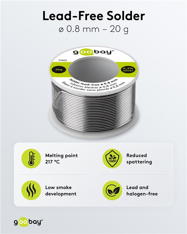20 gram blyfritt lödtenn med diameter 0.8 mm. Avsett för precisionslödning i elektronikapplikationer. Legeringen består av 99 % tenn, 0.3 % silver och 0.7 % koppar samt en flusskärna som utgör cirka 2.5 % av trådens tvärsnitt. Det integrerade flussmedlet ger homogena lödfogar med goda vätningsegenskaper och är av no-clean-typ, vilket innebär att rengöring efter lödarbete inte krävs. Lödtennet är halogenfritt och ger låg rökutveckling. Lämpligt för all form av elektroniklödning, inklusive SMD.