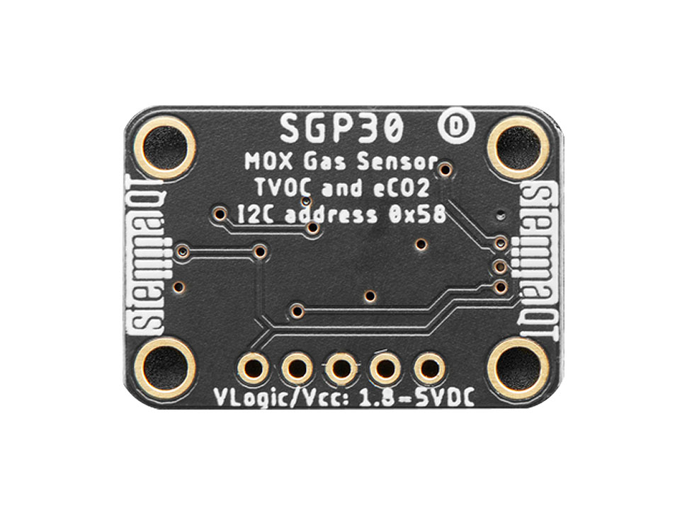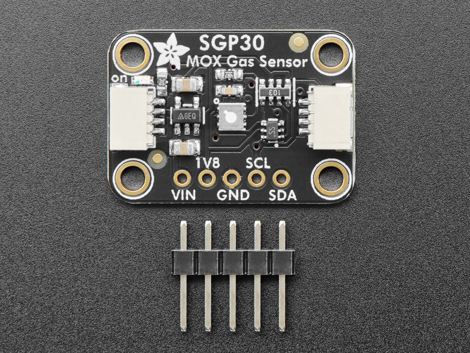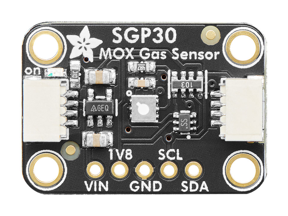 SGP30 är en integrerad MOX-gassensor från Sensirion för mätning av inomhusluftens kvalitet. Sensorn kommunicerar via I2C och har kalibrerade utsignaler med typisk noggrannhet på 15 %. Den kombinerar flera metalloxid-element på ett chip för att ge detaljerade mätvärden.