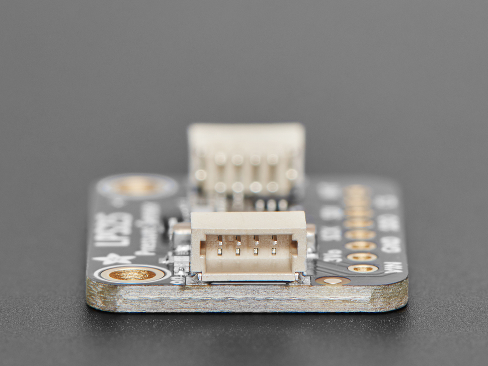 Qwiic-kontakter för smidig, lödfri anslutning av spänning och I2C med en kabel. Två kontakter - går att seriekoppla med andra Qwiic-kort.