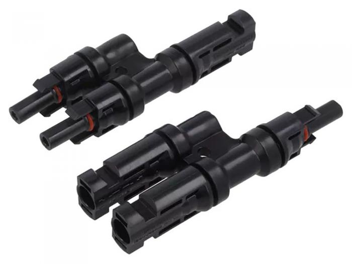 MC4-splitter för solcellspaneler. Levereras med två kontakter (1x hane till 2x hona och 1x hona till 2x hane). Klarar belastning upp till 50 A.