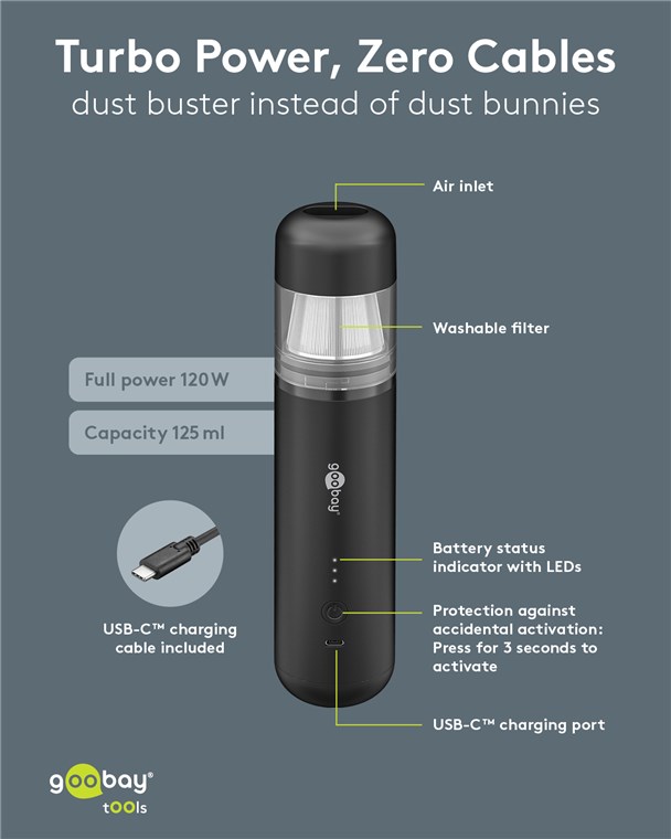 Laddningsbar minidammsugare, 120W. Smidig handdammsugare avsedd för rengöring av apparater, bilinteriörer, etc. Med en prestanda på upp till 120 W och flera munstycken erbjuds flexibel rengöring av exempelvis tangentbord, möbelspringor, bilens instrumentbräda och andra svåråtkomliga områden.