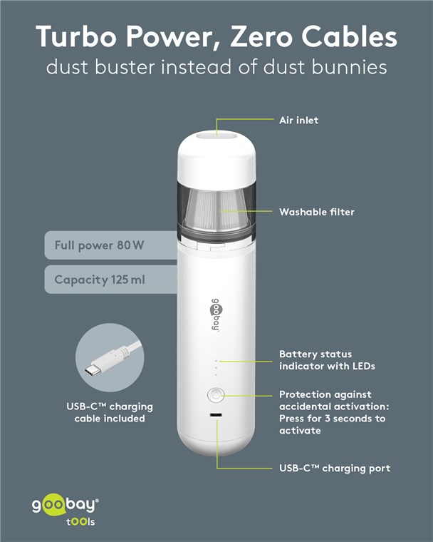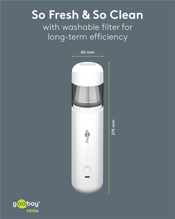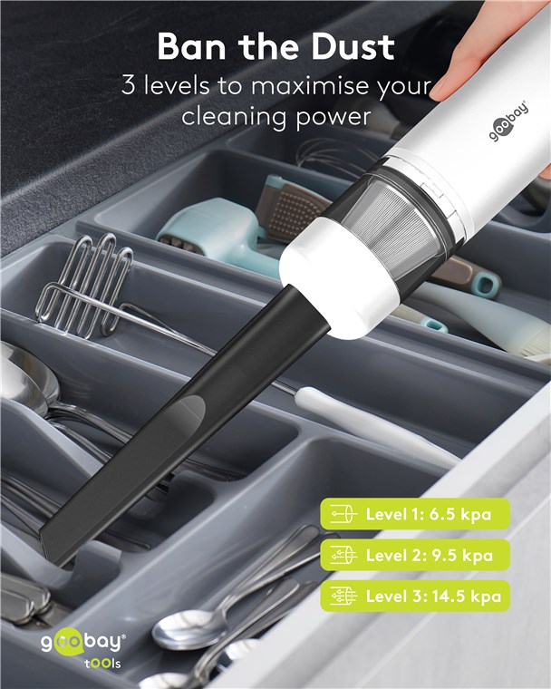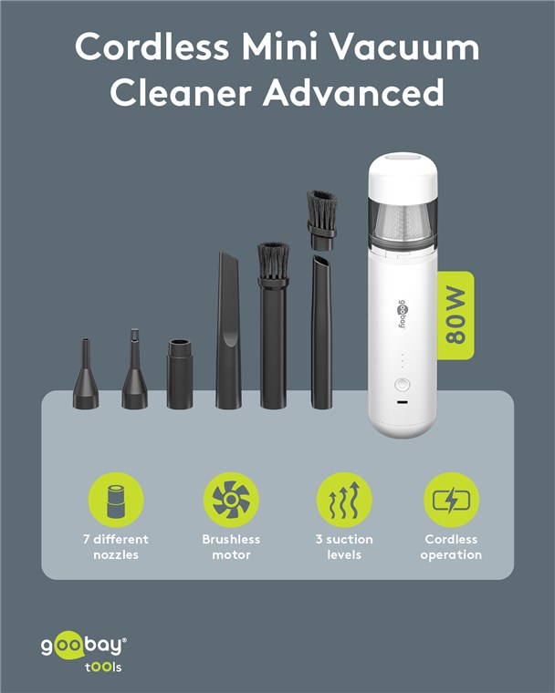 Laddningsbar minidammsugare, 80W. Smidig handdammsugare avsedd för rengöring av apparater, bilinteriörer, etc. Med en prestanda på upp till 80 W och flera munstycken erbjuds flexibel rengöring av exempelvis tangentbord, möbelspringor, bilens instrumentbräda och andra svåråtkomliga områden.