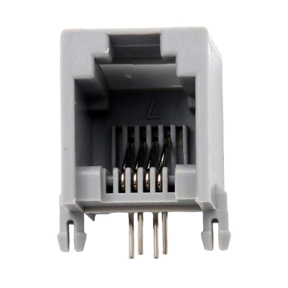 RJ11, 4-poligt modularuttag med 4 stift (6P4C) för kretskortsmontering (PCB). Andra benämningar: 6/4.
