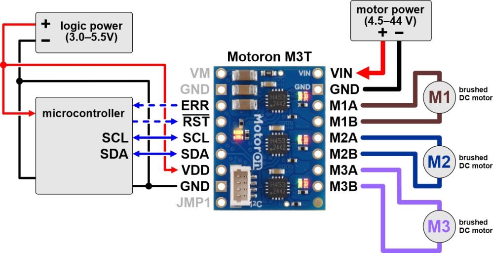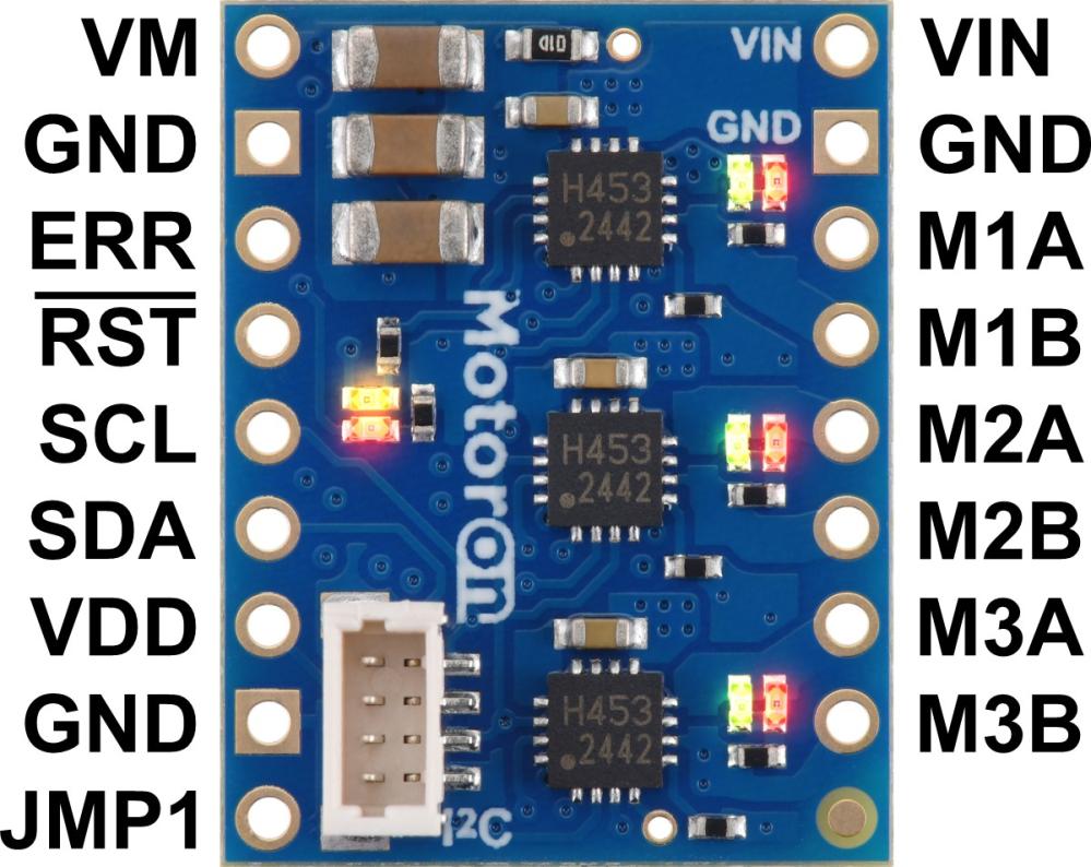 Motordrivare med tre separata kanaler och styrs enkelt via I2C. Lämplig för t.ex. trehjuliga robotar eller andra robotikprojekt där tre motorer behöver styras. Drivaren klarar motorspänningar från 4.5 till 44V och 0.8A kontinuerlig ström (upp till 2A stötvis). Flera drivare kan anslutas till samma I2C-bus om fler motorer ska styras från samma mikrokontroller. Lysdioder indikerar status för varje kanal. Strömmätning finns att tillgå för kanal 1 och 2.