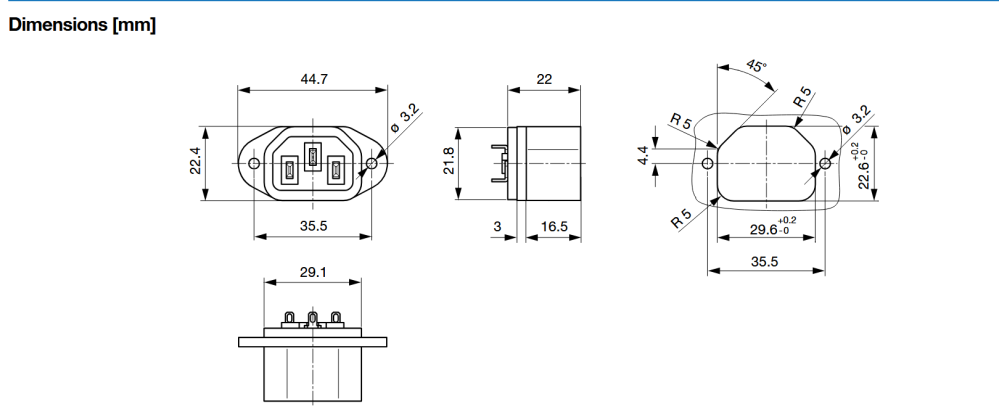 Nätbrunn för chassimontage med utstickande kontaktdel, lämplig för applikationer där lågt byggdjup krävs.