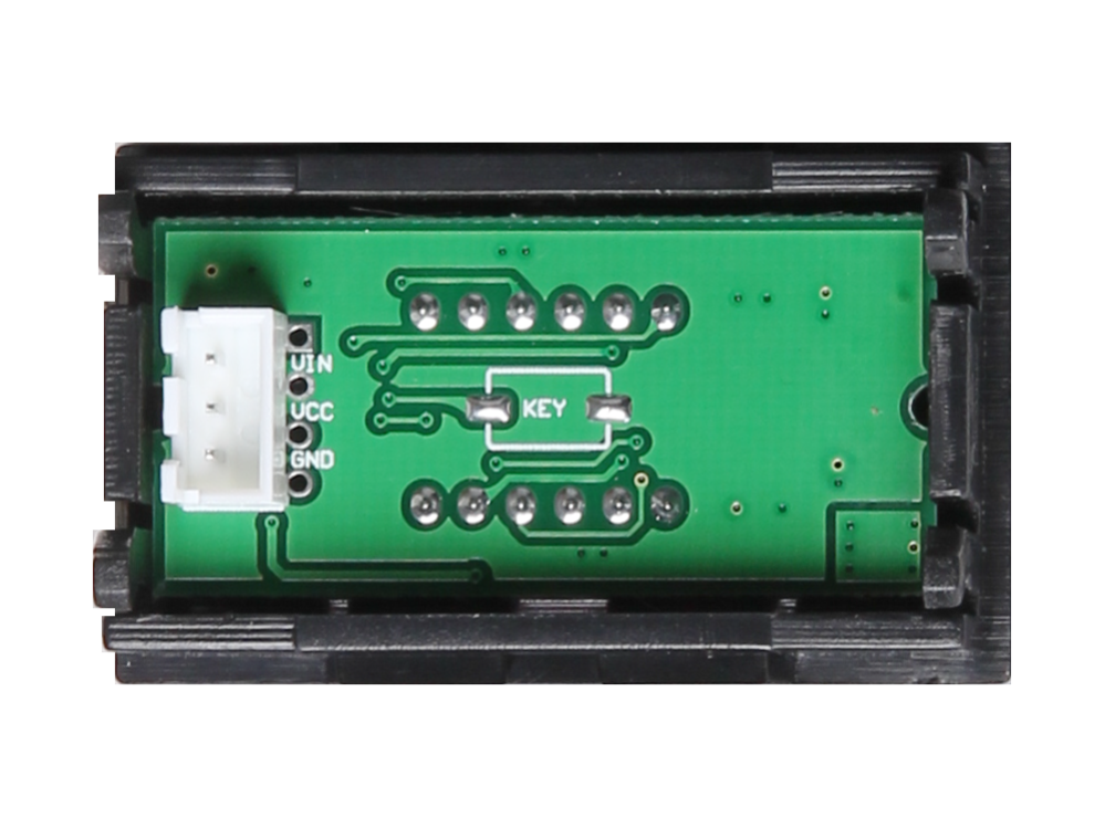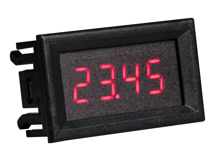 Spänningsmätare med fyra siffrors 7-segment LED-display, med röda tecken. Mäter spänningar från 0-33V DC med ±0,3% noggrannhet. Kan spänningsmatas med den uppmätta spänningen (som då behöver vara minst 3.5V och högst 30V).