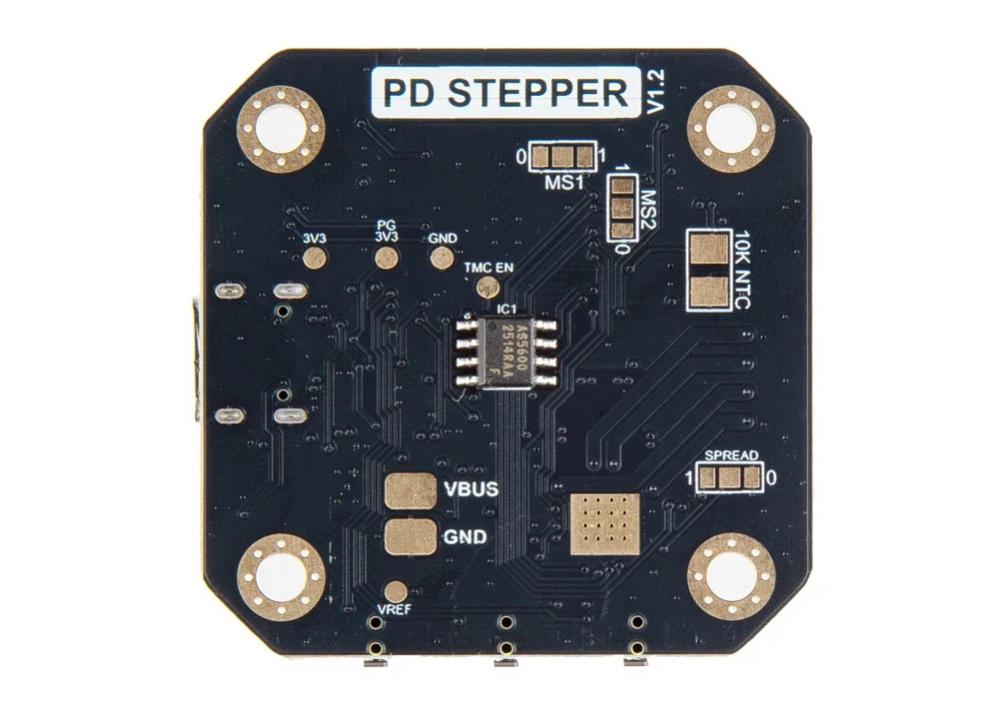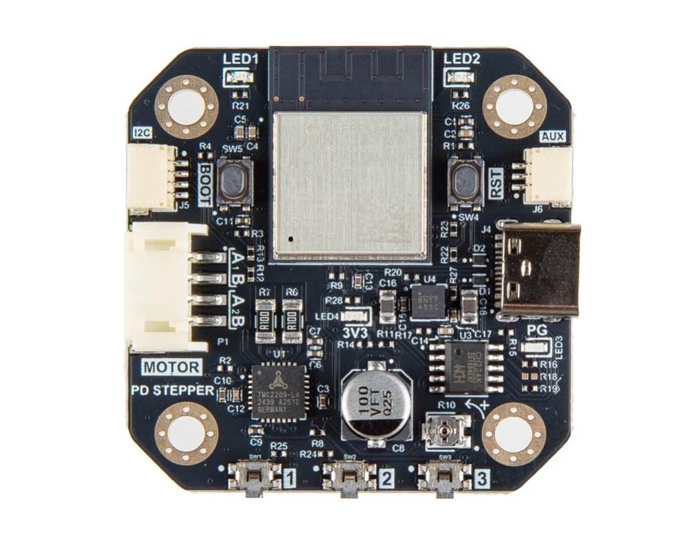 PD Stepper är en integrerad motorstyrningsmodul för NEMA 17-stegmotorer som kombinerar en kraftfull mikrokontroller, en tyst motorstyrkrets och positionsåterkoppling i en enda enhet. Den strömförsörjs över USB-C PD (Power Delivery), t.ex en vanlig USB-C-laddare. Styrenheten bygger på en ESP32-S3-mikrokontroller som hanterar kommunikation och styrning, medan den tysta TMC2209-drivaren kontrollerar stegmotorn med avancerade algoritmer för reducerat mekaniskt brus. En integrerad magnetisk encoder möjliggör sluten återkopplingsslinga för förbättrad positioneringsnoggrannhet jämfört med traditionella öppna system. Produkten är avsedd för applikationer där precis motorstyrning via USB-PD önskas, exempelvis IoT-styrda mekaniska system eller automatiseringsprojekt. Anslutning till dator eller strömkälla sker med USB-C.
