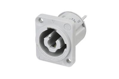 Denna modell är grå och avsedd som power-out (uttag). Den har tre poler (fas, neutral och skyddsjord) med snabb och säker bajonettlåsning.