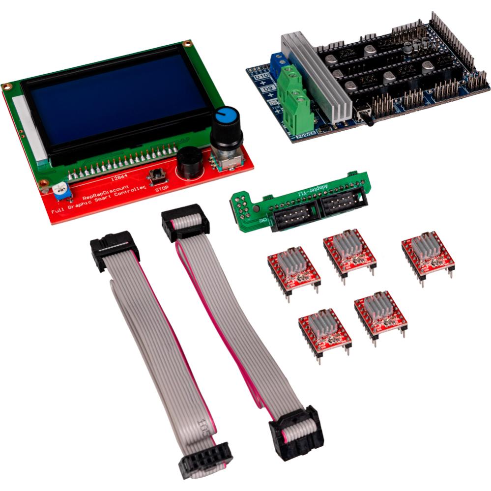 Levereras inklusive: RAMPS 1.6-kort, 20×4 LCD-display, 5× A4988 stegmotordrivare, anslutningskablar inklusive adapterkort för LCD, kylflänsar för MOSFET:ar och A4988-motordrivare