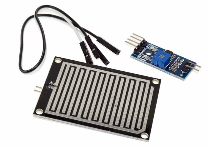 Sensor för att känna av regndroppar och vattenstänk. Sensorn är uppbyggd med en sensordel och en förstärkare. Sensordelen består av ett kretskort med ledningsbanor som, när vattendroppar lägger sig på kortet, delvis kortsluter banorna. Förstärkardelen omvandlar förändringen i resistans mellan ledningsbanorna på sensorkortet till en spänning som kan mätas med en mikrokontroller. På förstärkarkortet finns en trimpotentiometer för att justera känsligheten. Två utgångar finns tillgängliga, en digital som antingen är hög eller låg samt en analog utgång där spänningen varierar beroende på mängden vatten.