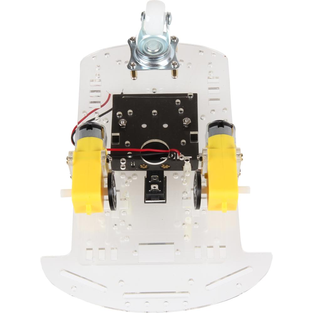 Konstruktionen är en tvåhjulsdriven robot (2WD) med två DC-motorer och ett främre stödhjul. Denna design gör att roboten kan rotera på plats och enkelt manövreras med hjälp av en motorstyrning och en mikrokontroller. Levereras med batterihållare, strömbrytare, hjul, motorer med växellåda samt monteringsdetaljer inklusive skruvar och muttrar. Se manual för exakt innehåll.